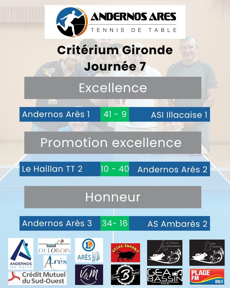 🏓 Victoire de nos 3 équipes hier soir pour la journée 7 de critérium de Gironde ! Un grand bravo 💪🏻👏🏻