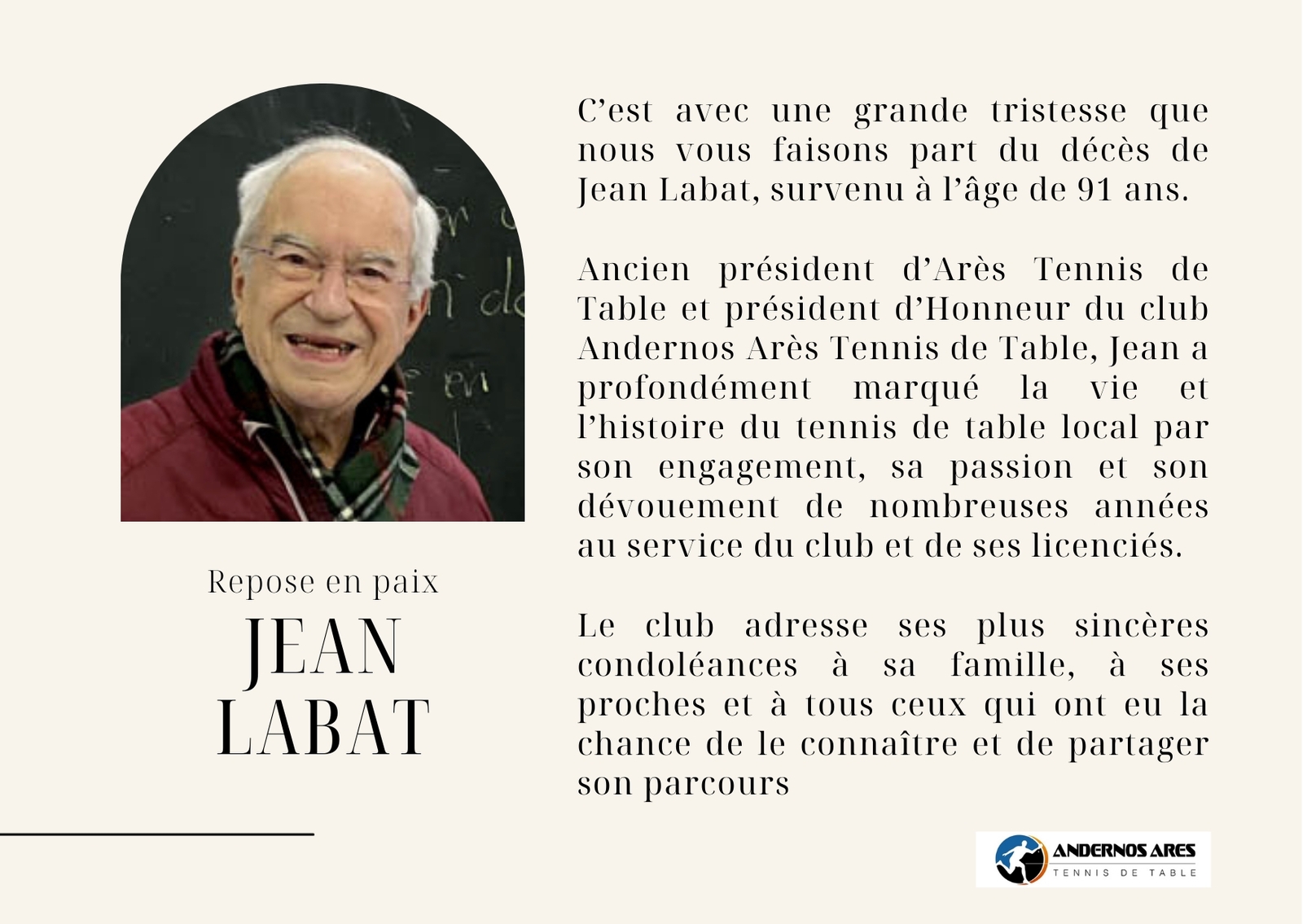 Ancien président d’Arès Tennis de Table et président d’Honneur du club Andernos Arès Tennis de Table, Jean a profondément marqué la vie et l’histoire du tennis de table local par son engagement, sa passion et son dévouement de nombreuses années au service du club et de ses licenciés.