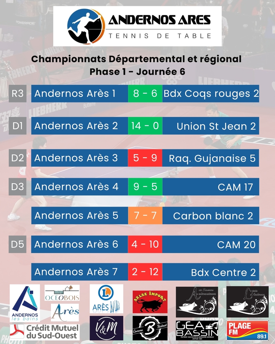 🏓 Le bilan des matchs de championnat régional et départemental du weekend est de 3 victoires, 1 nul et 3 défaites ! Bravo notamment à Kevyn (6) pour 2 belles perf contre un 7 et un 9 en D2 et à Philippe (5) pour sa perf contre un 7 en D3 ! ⏭️Prochains matchs vendredi 19 décembre pour le critérium de Gironde. Derniers matchs de la phase 1 le weekend des 10/11 janvier