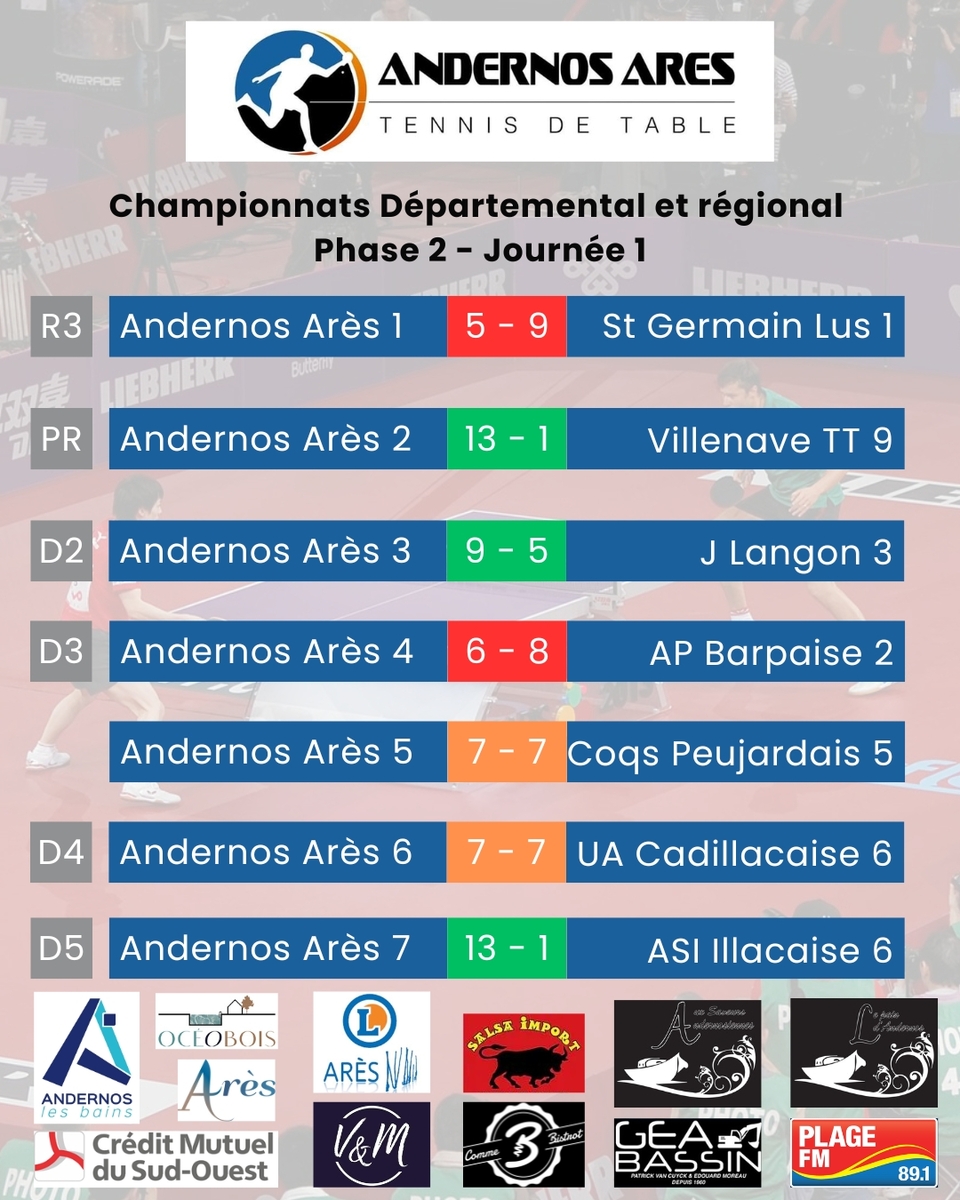 🏓 Ce weekend c'était le début de la phase 2 pour les championnats régional et départemental. Et le bilan est plutôt positif avec 3 victoires, 2 nuls et 2 défaites, ces dernières ne s'étant jouées à pas grand chose...
