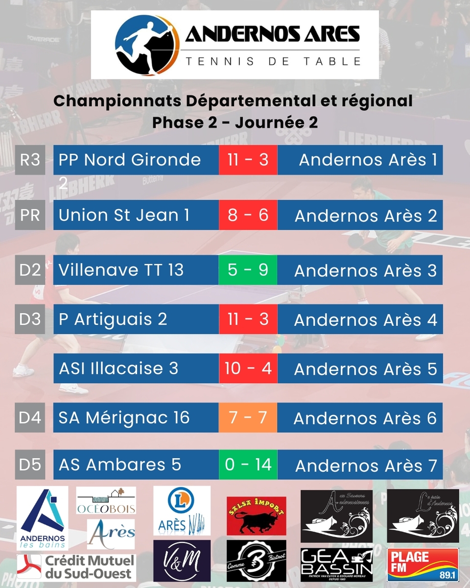 🏓 Avec un peu de retard voici les résultats de la 2eme journée de la phase 2 pour les championnats régional et départemental qui avait lieu ce weekend. Une journée compliquée avec 2 victoires, 1 nul et 4 défaites. On fait une pause de 2 semaines pour revenir plus fort !